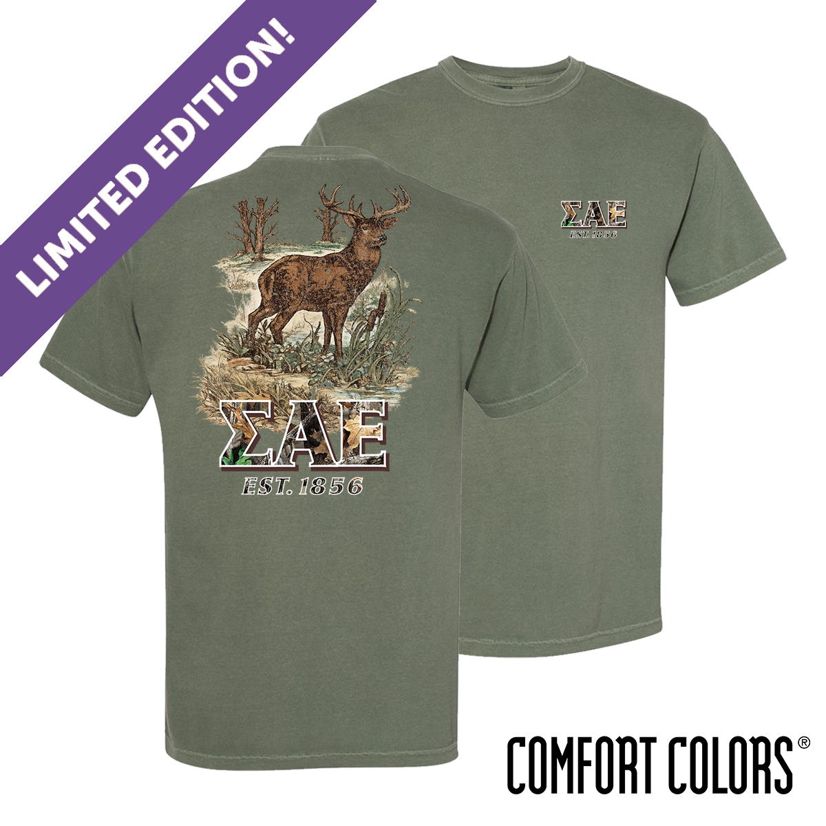 Stand strong in the Limited Edition Woodland Camo Tee. Built for bold SAE style and designed for men who take pride in their letters, this standout piece blends rugged outdoor grit with timeless brotherhood presence. Featuring a detailed woodland scene framed by towering trees and a striking buck centerpiece, the graphic makes a statement without overdoing it, bringing serious character to any chapter lineup while representing the strength and tradition of Sigma Alpha Epsilon.