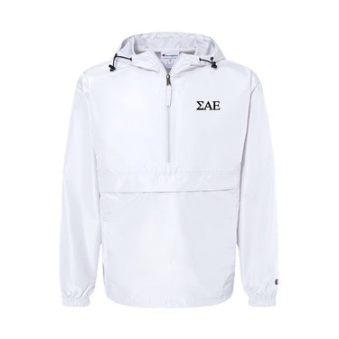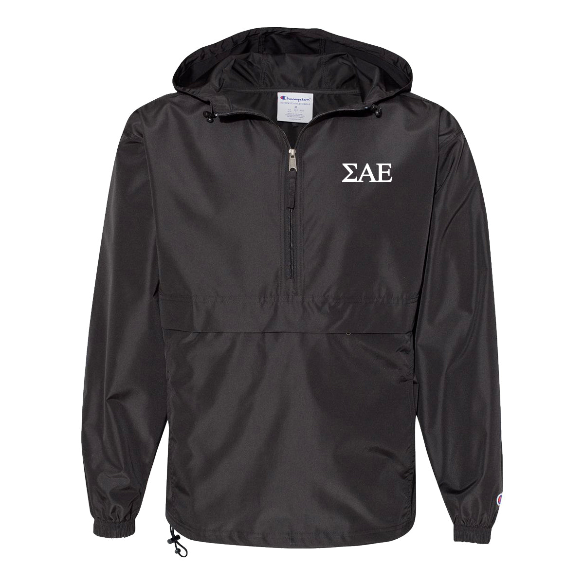 This SAE windbreaker is sleek and durable to last you through your college days! Whether you're caught in the rain on campus or celebrating a windy win for your school this wind and water-resistant jacket is all you'll need. This windbreaker comes with subtle Sigma Alpha Epsilon Greek letters on the left chest.