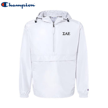 This SAE Champion windbreaker is sleek and durable to last you through your college days! Whether you're caught in the rain on campus or celebrating a windy win for your school this wind and water-resistant jacket is all you'll need. This windbreaker comes with subtle Sigma Alpha Epsilon Greek letters on the left chest.