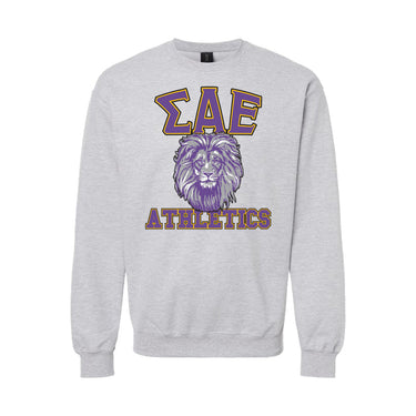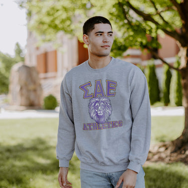 Rep your letters with our new SAE Athletics crewneck. This heather grey sweatshirt features a powerful lion emblem centered on the chest, symbolizing the strength and leadership of your brotherhood. SAE Greek letters above and "ATHLETICS" below are displayed in your signature purple, gold, and black colors. Comfortable, durable, and stylish, it's perfect for chapter events, campus life, and showcasing your Sigma Alpha Epsilon pride.