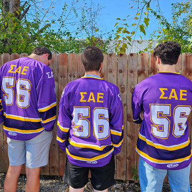 Show your fraternity pride on the ice or around campus with this Sublimated Hockey Jersey. Featuring your crest boldly printed on the front and "Sigma Alpha Epsilon" "56" on the back, this hockey jersey screams SAE.