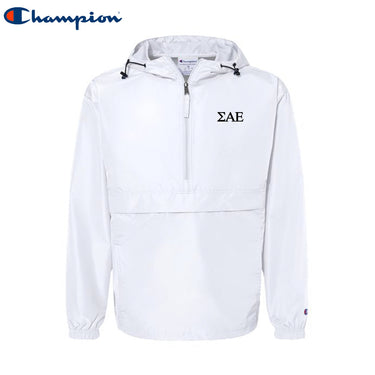 This SAE Champion windbreaker is sleek and durable to last you through your college days! Whether you're caught in the rain on campus or celebrating a windy win for your school this wind and water-resistant jacket is all you'll need. This windbreaker comes with subtle Sigma Alpha Epsilon Greek letters on the left chest and the iconic Champion logo on the left sleeve cuff.