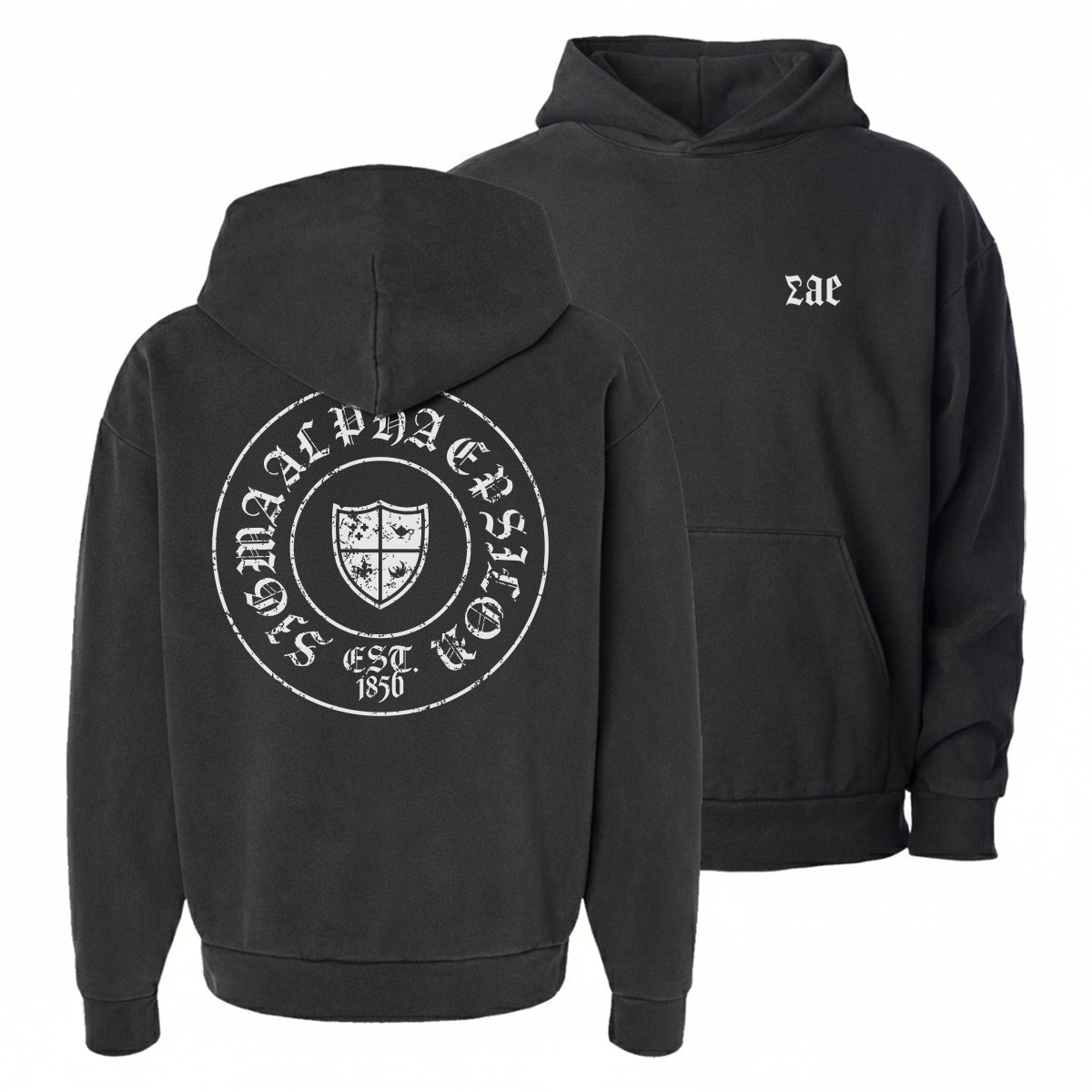 Stand strong with the SAE Iron Brotherhood Heavyweight Hoodie. Built for bold fraternity style and inspired by high-end streetwear with a gothic edge, this 10oz hoodie delivers serious weight and serious style. Made from ultra-comfortable heavyweight fleece and designed without a drawstring for a modern, streamlined look, it's perfect for post-chapter hangs, game days, or late-night runs to the Sigma Alpha Epsilon house. Whether you're layering up or making a statement, the Iron Brotherhood Hoodie brings fraternity pride into the streetwear spotlight.